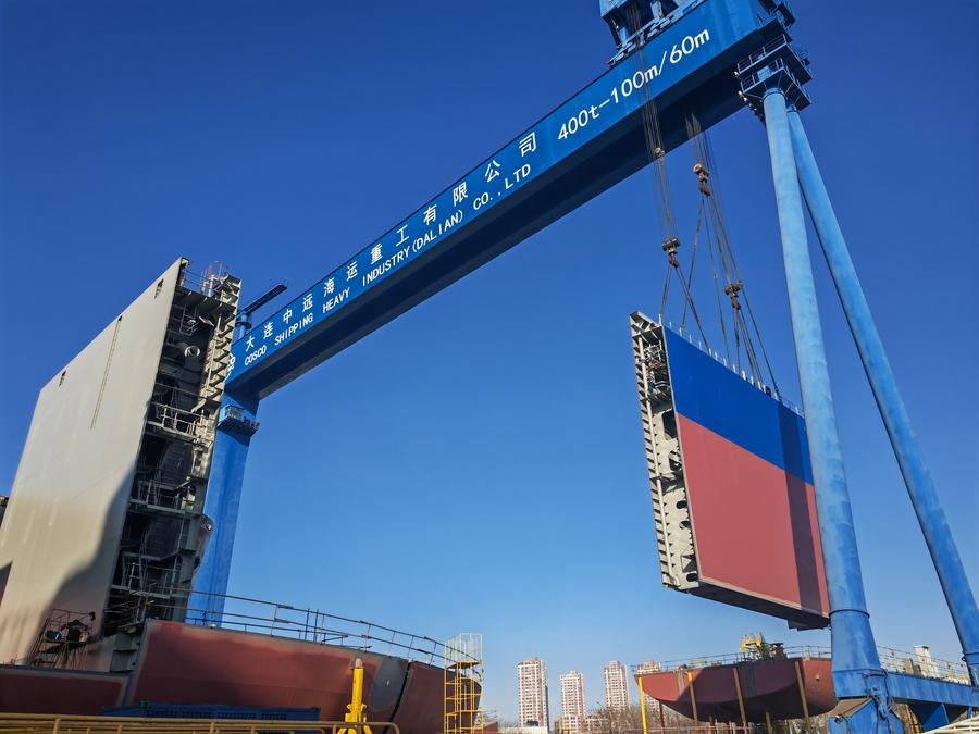 [신화망 선양 1월5일] 지난 1일 다롄중위안(大連中遠)해운중공업회사의 조선대에서 갠트리 크레인이 천천히 이동하며 날카로운 경보음을 울린다.