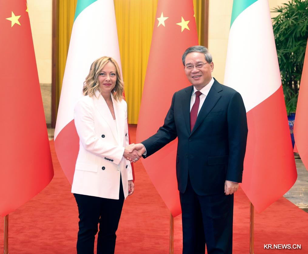 [신화망 베이징 7월29일]리창(李强) 중국 국무원 총리가 28일 오후 베이징 인민대회당에서 중국을 공식 방문한 조르자 멜로니 이탈리아 총리와 회담했다.[촬영/신화사 기자 류웨이빙(劉衛兵)]