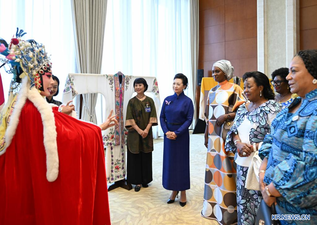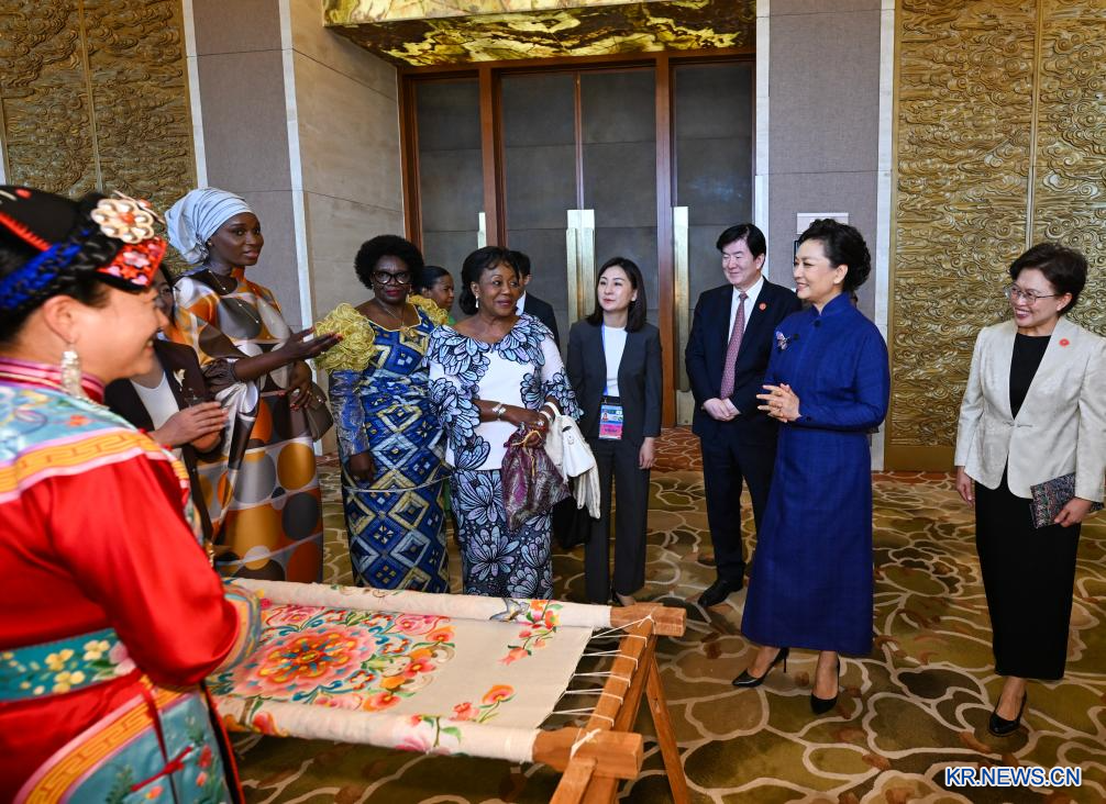 펑리위안 여사와 아프리카 귀빈들이 중국 전통문화와 여성교육 성과 전시를 둘러보고 있다.