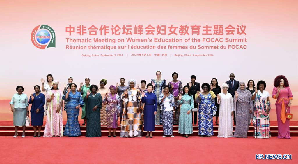 중국∙아프리카 여성 교육을 주제로 한 회의가 5일 오전 베이징 댜오위타이 국빈관에서 열렸다. 시진핑(習近平) 중국 국가주석의 부인이자 유네스코 여성·여아교육 촉진 특사인 펑리위안(彭麗媛) 여사가 회의에 참석해 축사를 했다. "2024 중국∙아프리카 협력포럼(FOCAC) 정상회의’ 참석차 중국을 방문한 아프리카 국가 정상 배우자 및 대표 26명이 함께 회의에 참가했다.[촬영/신화사 기자 셰환츠(謝環馳)]