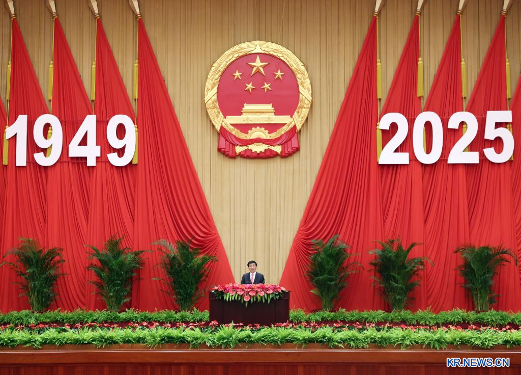 [신화망 베이징 9월29일] 전국인민정치협상회의(정협) 판공청, 중국공산당 중앙통전부, 국무원 교민업무판공실, 국무원 홍콩∙마카오 판공실, 국무원 타이완업무 판공실, 중화전국귀국화교연합회가 28일 베이징 인민대회당에서 공동으로 국경절 리셉션을 열어 중화인민공화국 건국 76주년을 기념했다. 왕후닝(王滬寧) 중국 공산당 중앙정치국 상무위원 겸 정협 주석이 참석해 축사를 했다.[촬영/신화사 기자 류웨이빙(劉衛兵)]