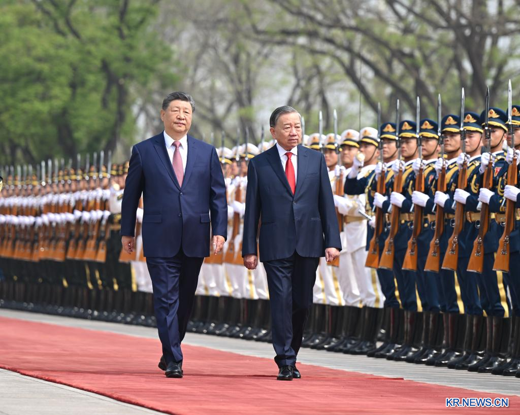 [신화망 베이징 4월 16일] 시진핑(習近平) 중국 공산당 중앙위원회 총서기, 국가주석이 15일 오전 베이징 인민대회당에서 중국을 국빈 방문한 또 럼 베트남 공산당 서기장, 국가주석과 회담했다. 회담에 앞서 시진핑 주석이 인민대회당 동문 밖 광장에서 또 럼 서기장을 위한 환영식을 열었다.[촬영/신화통신 기자 옌옌(燕雁)]
