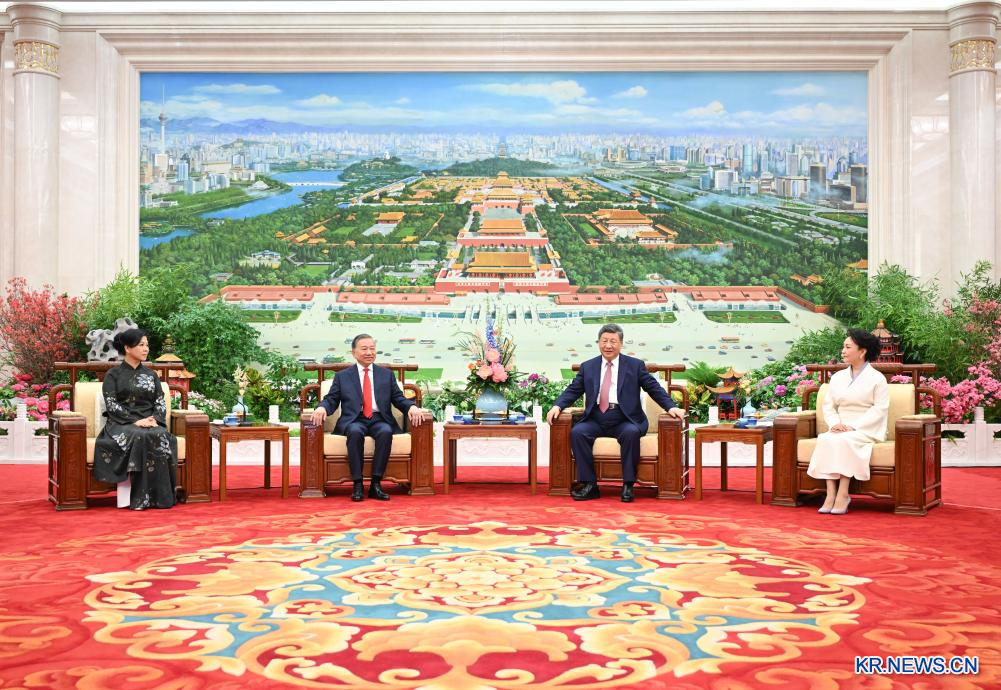 [신화망 베이징 4월 16일] 시진핑(習近平) 중국 공산당 중앙위원회 총서기, 국가주석과 부인 펑리위안(彭麗媛) 여사가 15일 오후 베이징 인민대회당에서 중국을 국빈 방문한 또 럼 베트남 공산당 서기장, 국가주석 및 부인 응오프엉리 여사와 작별 인사를 나눴다. [촬영/신화통신 기자 리샹(李響)]