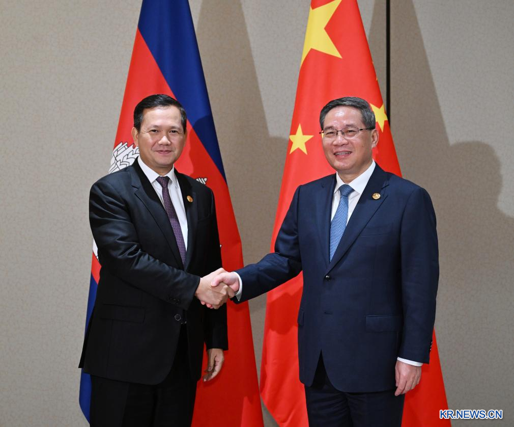 [신화망 자카르타 9월7일] 리창(李强) 중국 국무원 총리가 현지시간으로 6일 오후 자카르타에서 동아시아 협력 지도자 시리즈 회의 참석 기간에 훈 마넷 캄보디아 총리를 만났다.
