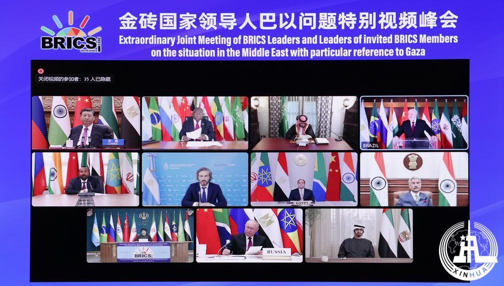 시 주석은 브릭스 협력 메커니즘은 신흥 시장 국가와 개도국이 단결∙협력을 강화하고 공동이익을 수호하는 중요한 플랫폼이라고 강조했다. 그러면서 오늘 우리는 팔-이 문제에 대해 입장을 조율하고 행동에 나서 새 회원국을 맞이한 후의 "대(大)브릭스 협력"에 좋은 시작을 열어주었다고 전했다. 이어 중국은 다른 회원국과 함께 브릭스 협력의 신시대를 열어 나가겠다고 덧붙였다.