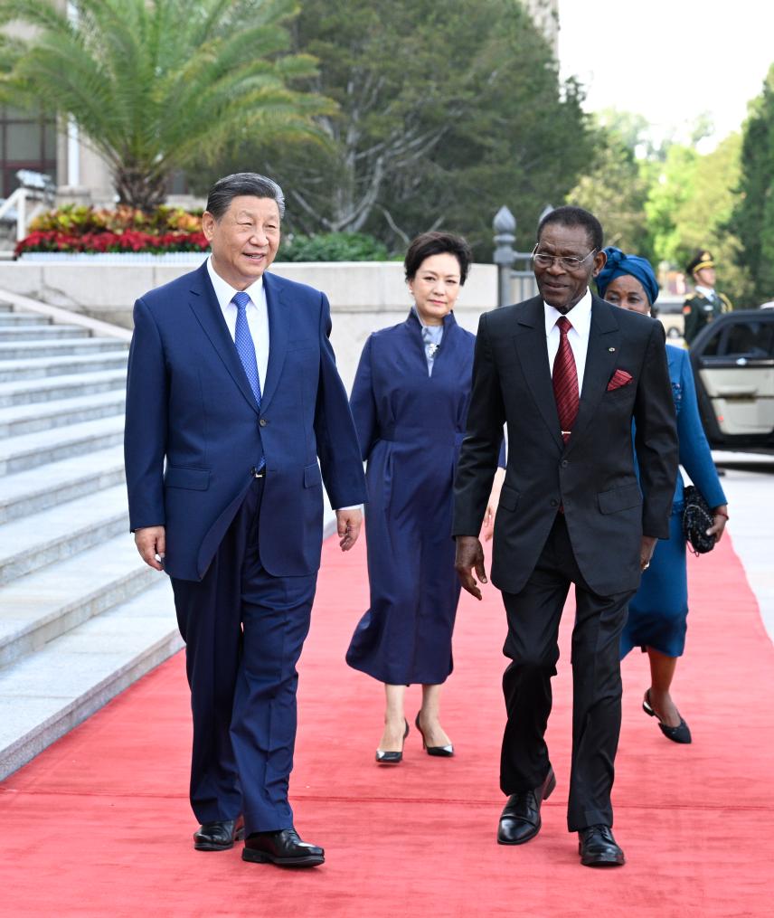 시진핑(習近平) 중국 국가주석이 28일 오후 베이징 인민대회당에서 중국을 국빈 방문한 테오도로 오비앙 응게마 음바소고 적도기니 대통령과 회담했다. 회담에 앞서 시 주석과 부인 펑리위안 여사는 인민대회당 동문 밖 광장에서 오비앙 대통령 부부를 위한 환영식을 열었다. [촬영/신화사 기자 리쉐런(李學仁)]