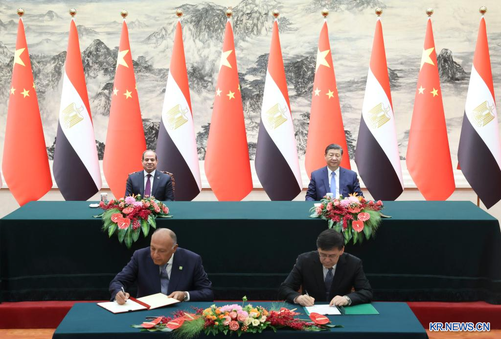 시진핑(習近平) 중국 국가주석이 지난 29일 오후 베이징 인민대회당에서 제10차 중국-아랍 협력포럼 장관급 회의 개막식 참석차 중국을 방문한 압델 파타 엘시시 이집트 대통령과 회담을 가졌다. 회담 후 양국 정상은 여러 양자 간 협력 문서에 서명하는 것을 함께 지켜봤다.[촬영/신화사 기자 딩하이타오(丁海涛)]