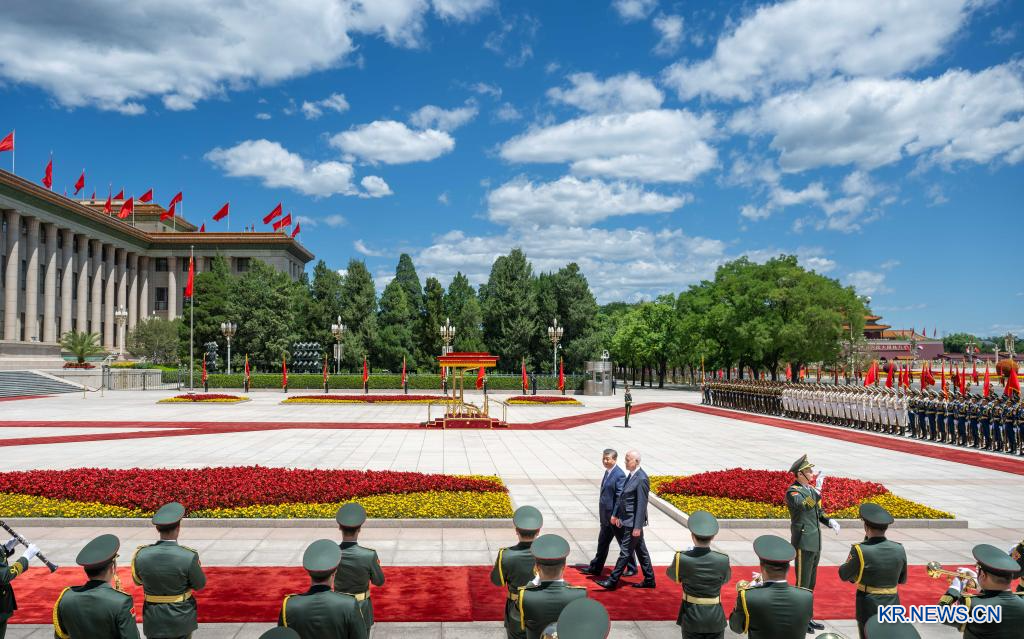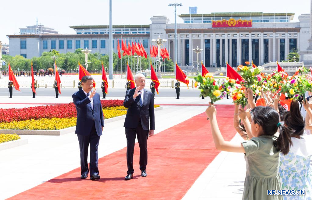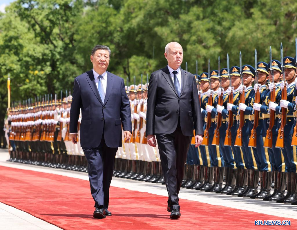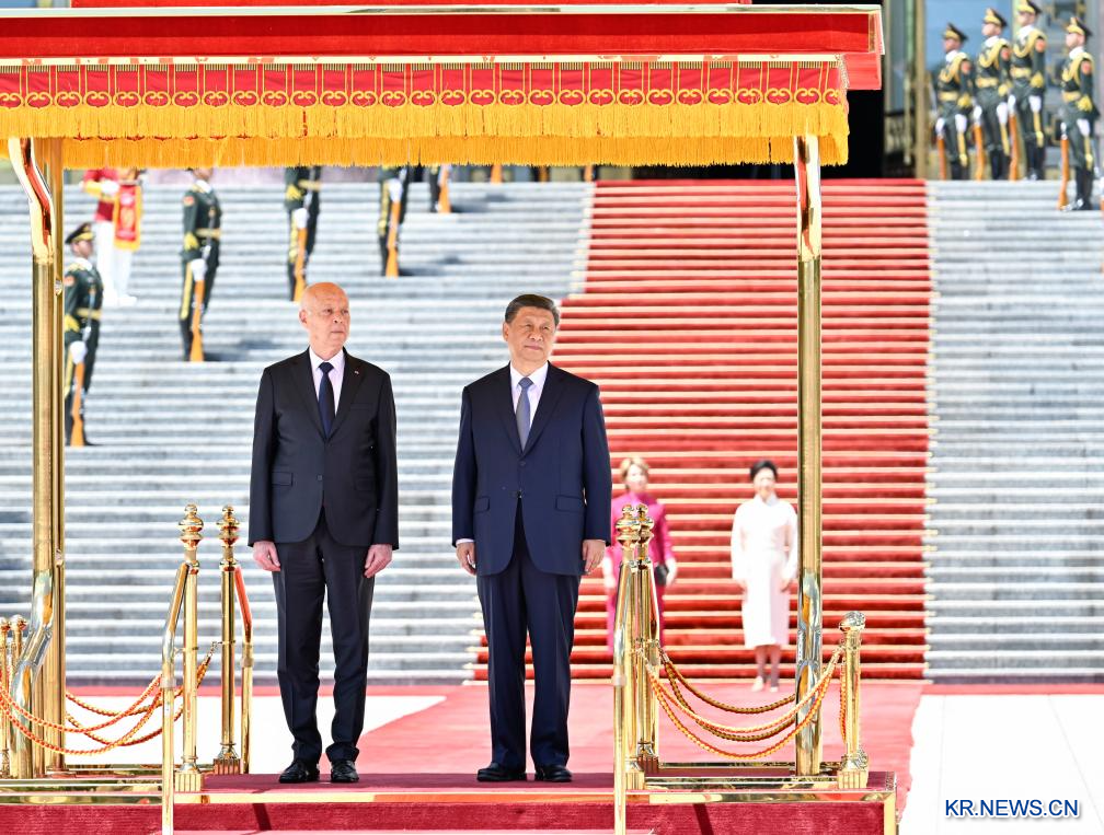 [신화망 베이징 6월1일] 31일 오전 시진핑(習近平) 중국 국가주석이 베이징 인민대회당에서 "중국-아랍국가 협력포럼 제10차 장관급 회의" 개막식 참석차 중국을 국빈 방문한 카이스 사이에드 튀니지 대통령과 회담했다. 회담에 앞서 시 주석은 인민대회당 동문 밖 광장에서 사이에드 대통령을 위해 환영식을 열었다.[촬영/신화사 기자 딩하이타오(丁海涛)]