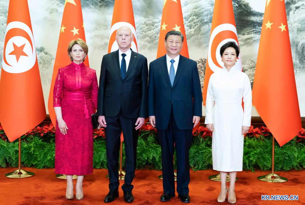 31일 오전 시진핑(習近平) 중국 국가주석이 베이징 인민대회당에서 "중국-아랍국가 협력포럼 제10차 장관급 회의" 개막식 참석차 중국을 국빈 방문한 카이스 사이에드 튀니지 대통령과 회담했다. 회담에 앞서 시 주석과 부인 펑리위안 여사가 사이에드 대통령 부부와 기념 촬영을 했다.[촬영/신화사 기자 황징원(黄敬文)]