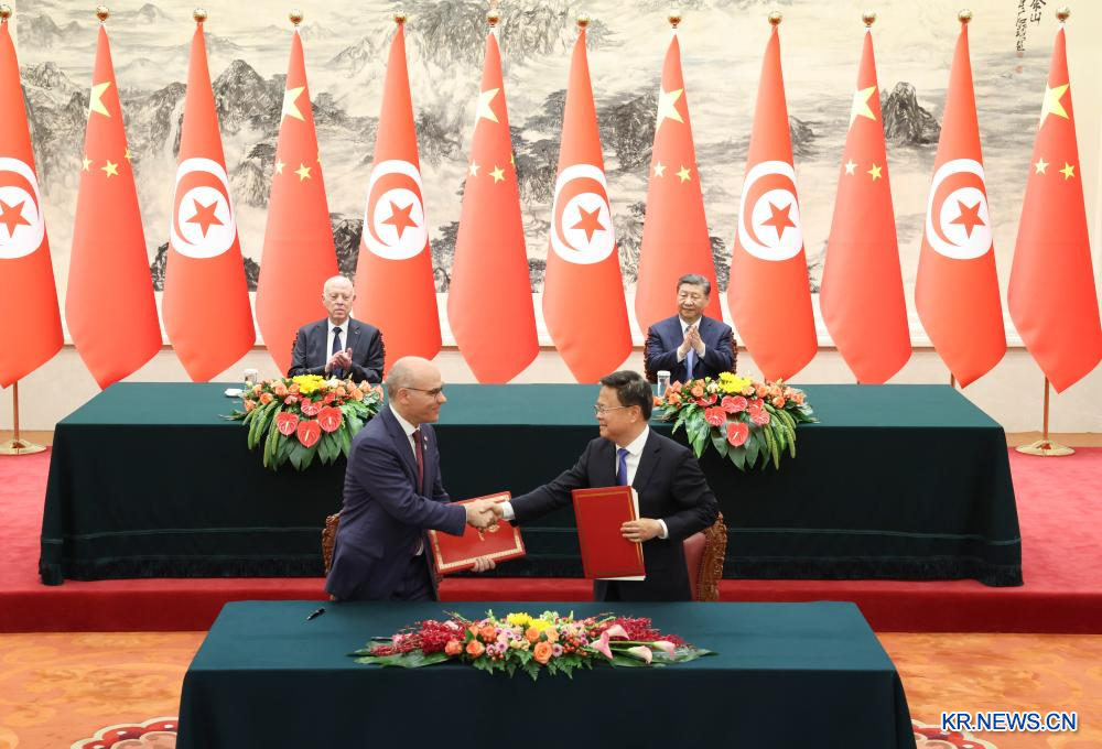31일 오전 시진핑(習近平) 중국 국가주석이 베이징 인민대회당에서 "중국-아랍국가 협력포럼 제10차 장관급 회의" 개막식 참석차 중국을 국빈 방문한 카이스 사이에드 튀니지 대통령과 회담했다. 회담 후 양국 정상은 녹색 저탄소 발전·투자 등 분야 관련 여러 양자 간 협력 문서에 서명하는 것을 함께 지켜봤다.[촬영/신화사 기자 딩하이타오(丁海涛)]