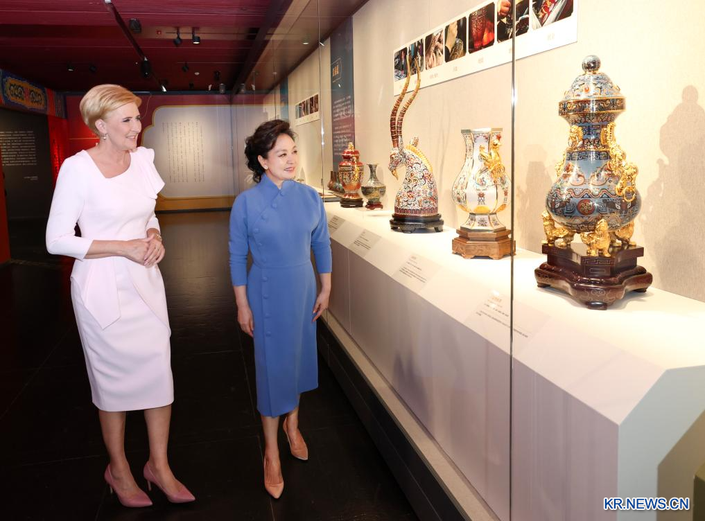 양국 정상 부인이 함께 예술관에서 "베이징 옌징팔절(燕京八絕) 무형문화유산 예술품 특별전’을 관람하고 있다. [촬영/신화사 기자 팡싱레이(龐興雷)]